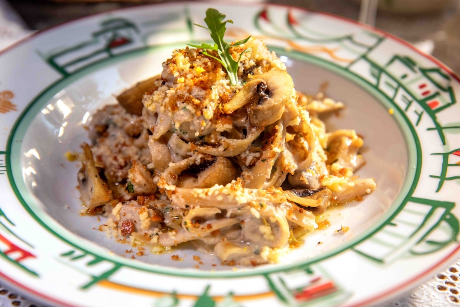 Тальятелле в сливочном соусе с говядиной, сладким перцем, красным вином и грибами